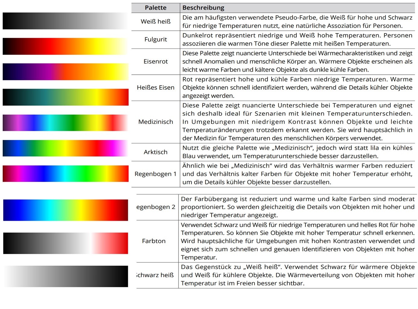 3. Geeignete Farbskalen und typische Temperaturbereiche (Tint, IronHot, Medical).